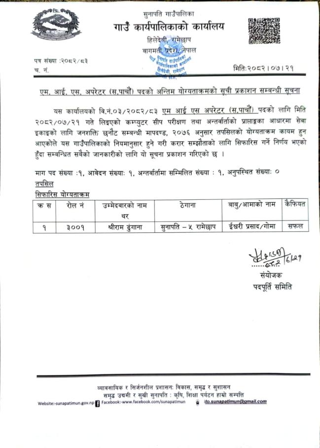 एम आइ एस अपरेटर (स पाचौँ) पदको अन्तिम योग्यताक्रम सम्बन्धी सूचना