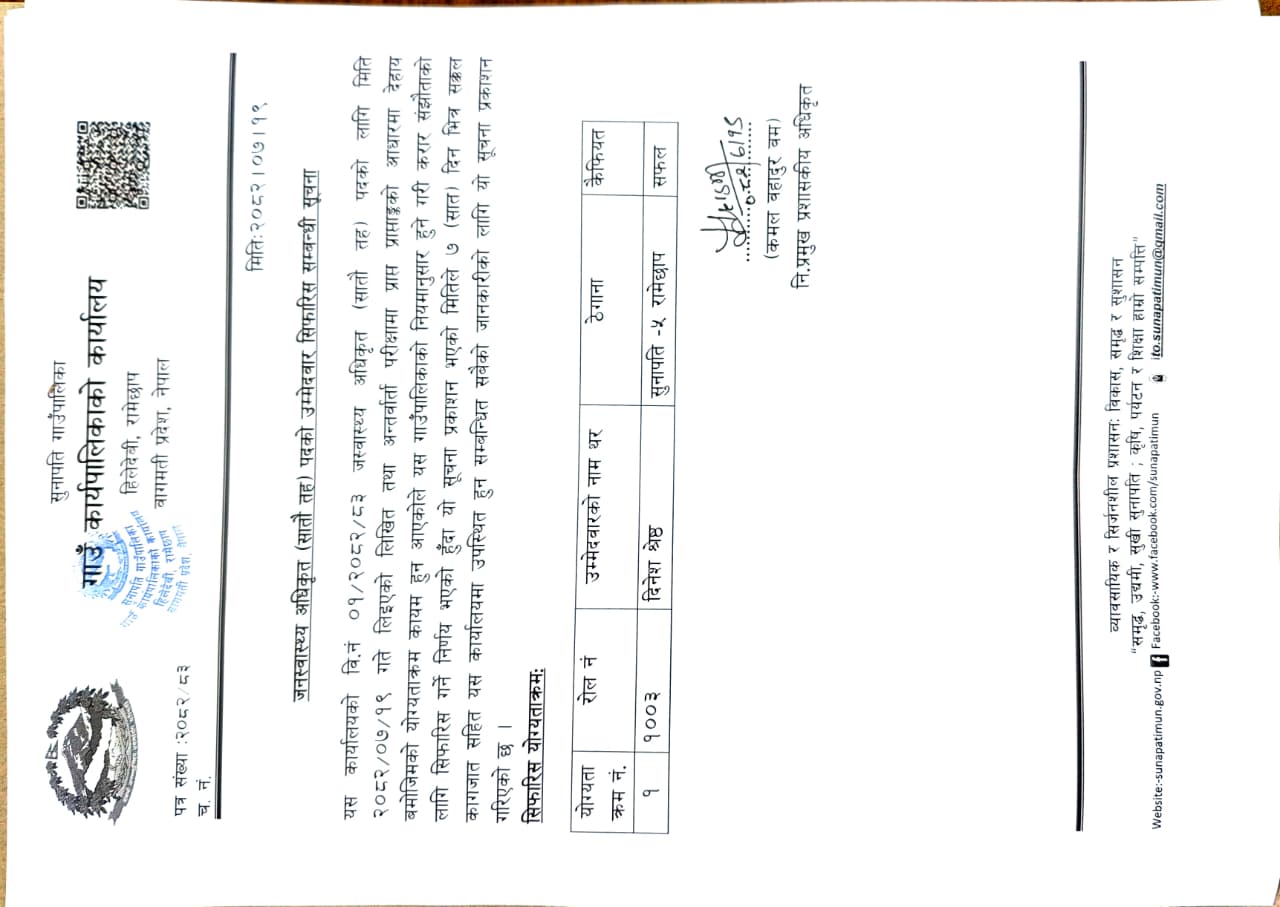 सुनापति गाउँपालिका अन्तर्गतका दीर्घ रोगीहरूको विवरण सार्वजनिक सम्बन्धी सूचना