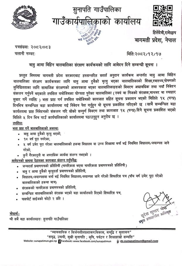 बाबु आमा विहिन बालवालिका संरक्षण कार्यक्रमको लागि आवेदन दिने सम्बन्धमा