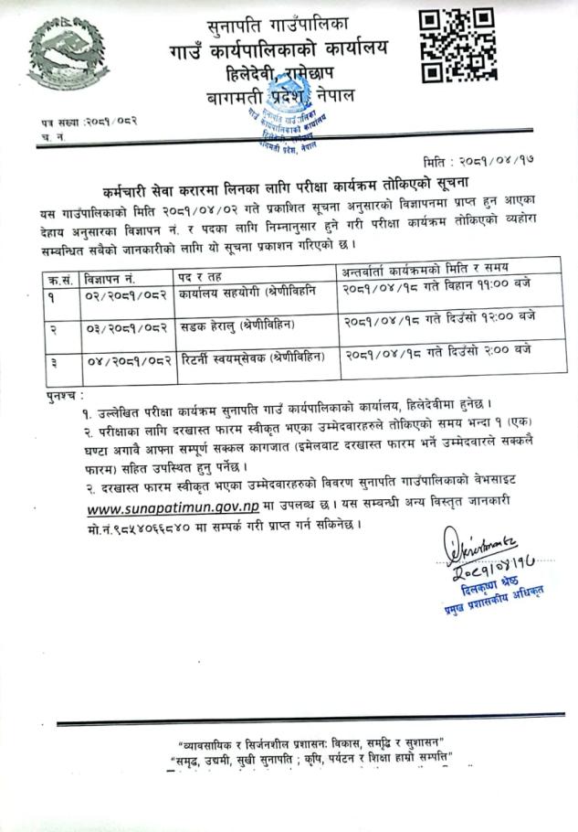 » कर्मचारी सेवा करारमा लिनको लागि परीक्षा कार्यक्रम तोकिएको सम्बन्धी सूचना