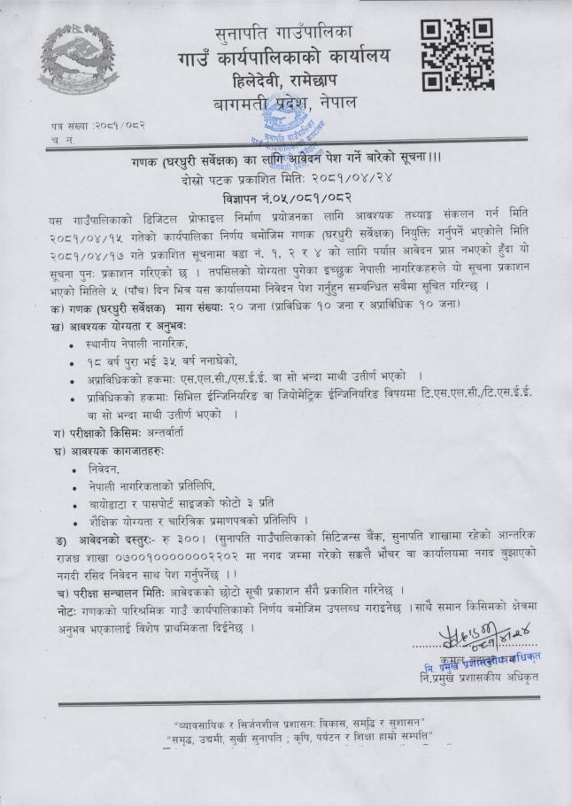 गणक (घरधुरी सर्वेक्षक) का लागि आवेदन पेश गर्ने म्याद थप सम्बन्धी सूचना
