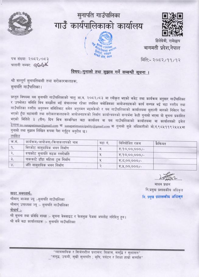 गुनासो तथा सुझाव गर्ने सम्बन्धी सूचना