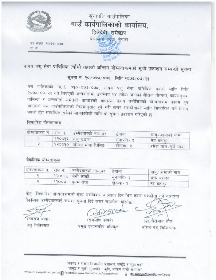 नायब पशु सेवा प्राबिधिक (चौथो तह)को अन्तिम योग्यताक्रमको सूची प्रकाशन सम्बन्धी सूचना