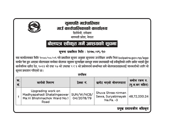 मध्यपहाडी शतालिंगेस्वर भिष्मचोक सडक स्तरोन्नतिको बोलपत्र स्वीकृत गर्ने आशयको सूचना