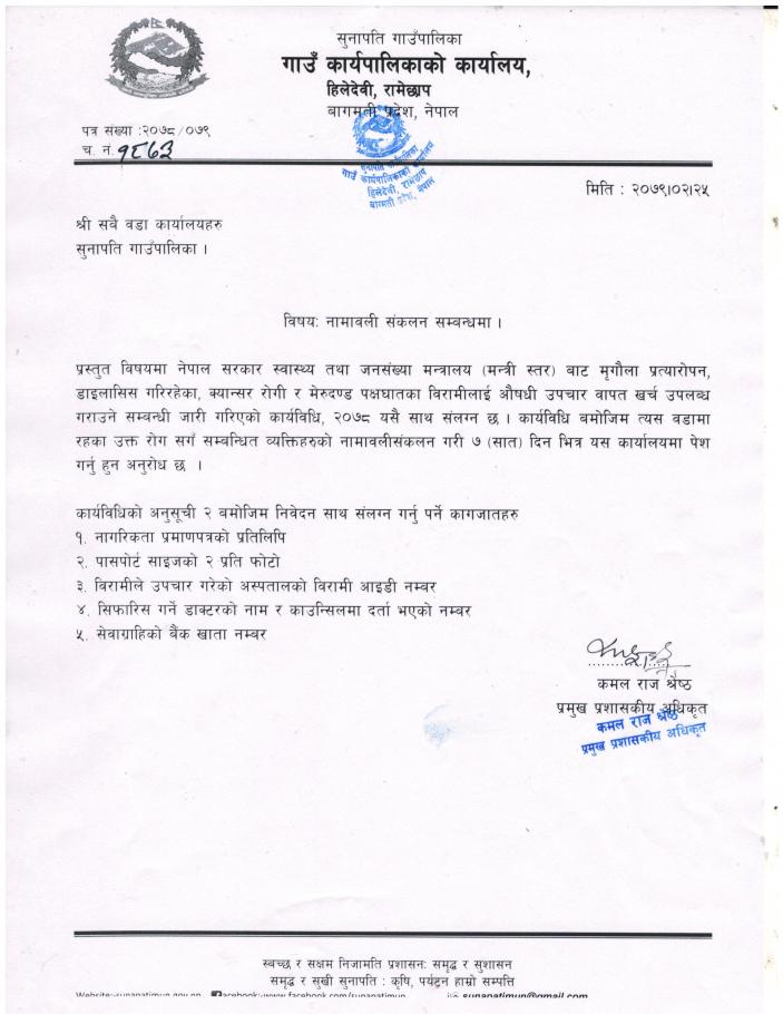 मृगौला प्रत्यारोपन, डाइलासिस गरिरहेका, क्यान्सर रोगी र मेरुदण्ड पक्षघातका विरामीलाई औषधी उपचार वापत खर्च उपलब्ध गराउने सम्बन्धी जारी गरिएको कार्यविधि, अनुसार नामावली संकलन गर्ने सम्बन्धमा
