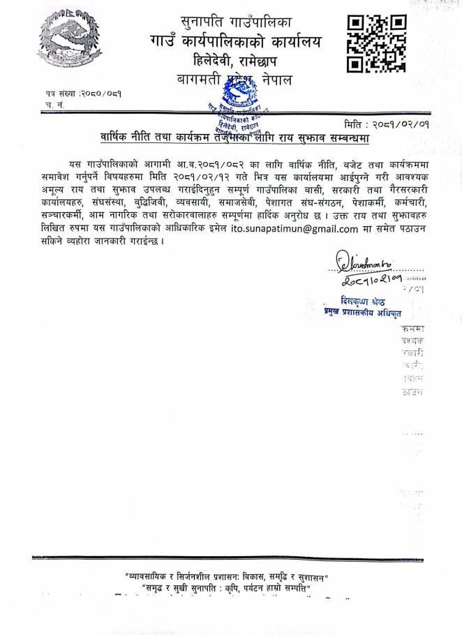 वार्षिक नीति तथा कार्यक्रम तर्जुमाका लागि राय सुझाव माग सम्बन्धी सूचना