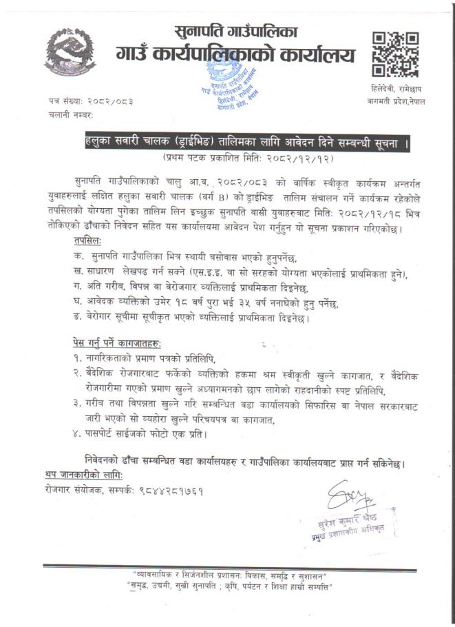 » हलुका सवारी चालक तालिमका लागि आवेदन दिने सम्बन्धी सूचना