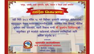 सुनापति आधारभूत अस्पतालको समुदघाट्न नेपाल सरकारका उर्जा जलस्रोत तथा सिंचाइ,भौतिक पुर्वाधार तथा यातायात र शहरी बिकास मन्त्री श्री कुलमान घिसिङज्युबाट हुने भएकोले यहाँहरुको उपस्थितिको लागि अनुरोध छ।